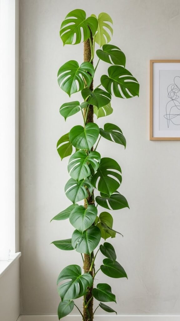 Use sculptural support like a moss pole or decorative trellis to train your Monstera upward. This not only helps plant growth but also makes the leaves look like living artwork against your wall.