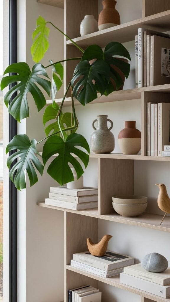 Monsteras make excellent shelf décor when styled with books, ceramics, and art. Trail the stems down or angle the leaves to fill negative space and soften hard edges.