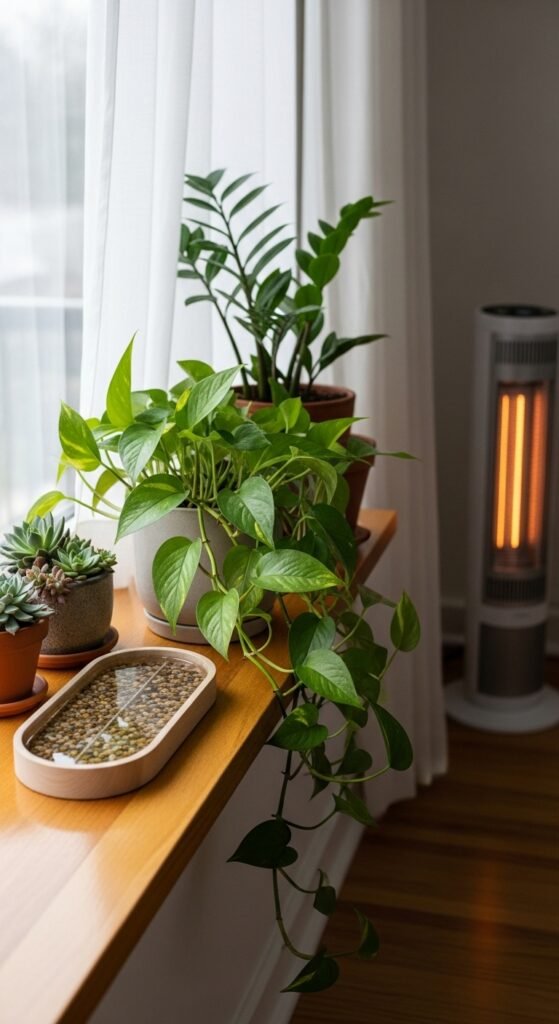 Indoor winter air is often very dry because of heaters. Pothos can tolerate low humidity, but it thrives at 40–60% humidity.