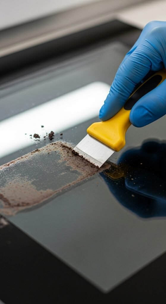 Sometimes DIY solutions loosen stains, but a thin layer still remains. A razor scraper helps safely remove the final layer—but only use it on glass oven doors, not metal interior surfaces.