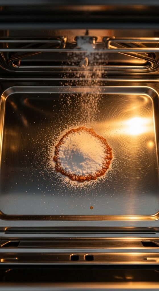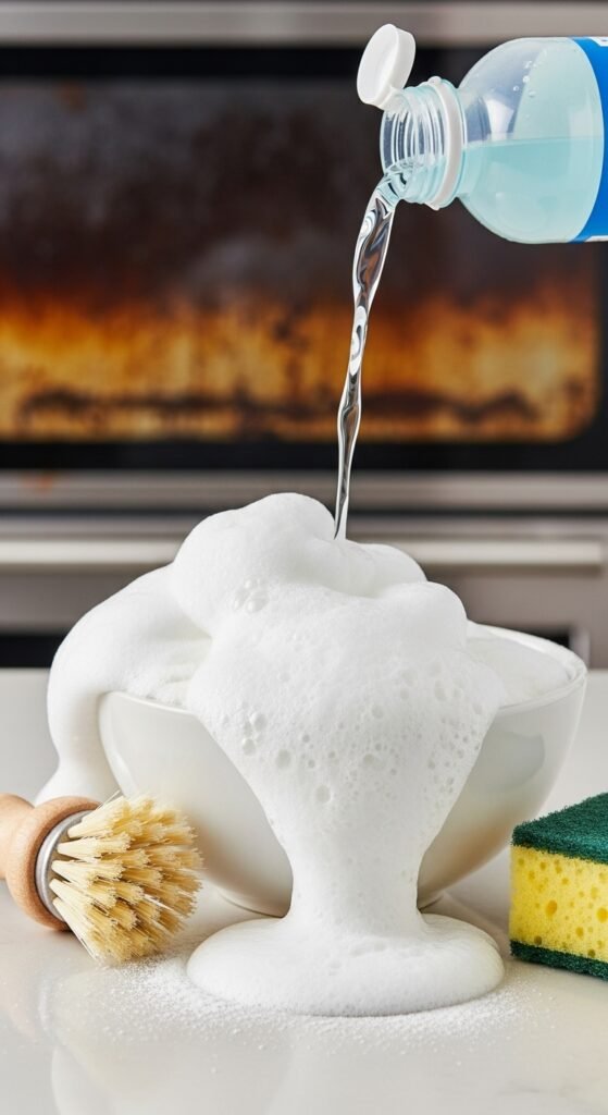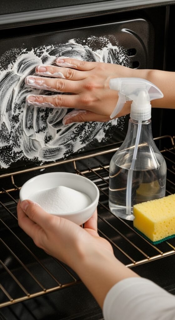 This remains one of the most powerful natural solutions for tough oven buildup. Mix ½ cup baking soda with 2–3 tablespoons of water until it forms a spreadable paste. Apply it over baked-on grease, leave it for 10–12 hours, then spray vinegar on top.