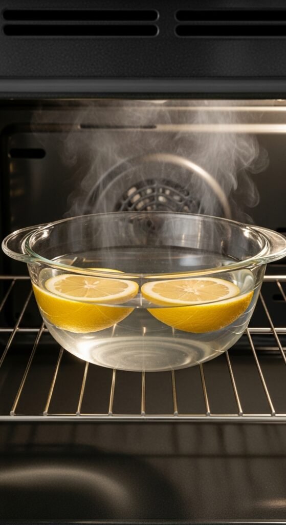If the stain is greasy or sticky, steam loosens everything. Cut two lemons, squeeze them into an oven-safe bowl with water, place it in the oven, and heat at 250°F for 30 minutes.