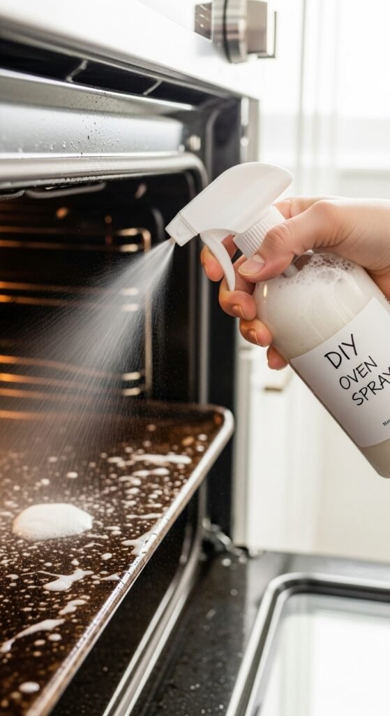 Heat until slightly thick, pour into a spray bottle, and shake. It sticks to vertical surfaces similarly to store-bought oven sprays and works well when left overnight.