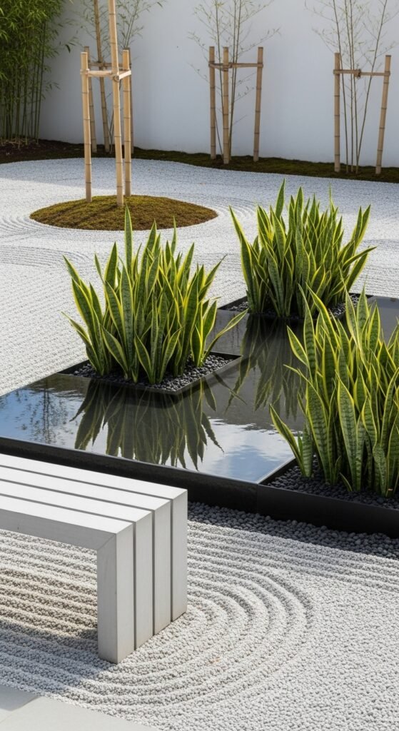 Why it works: Snake plants add structure and height while complementing the serene Zen aesthetic.