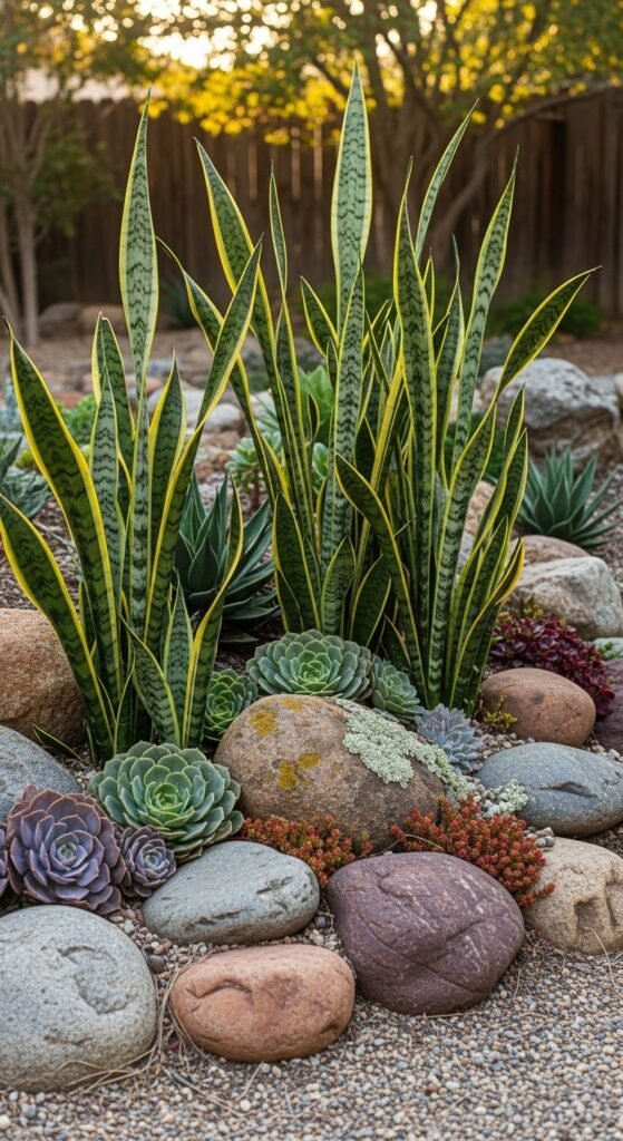 Idea: Incorporate snake plants into a backyard rock garden.