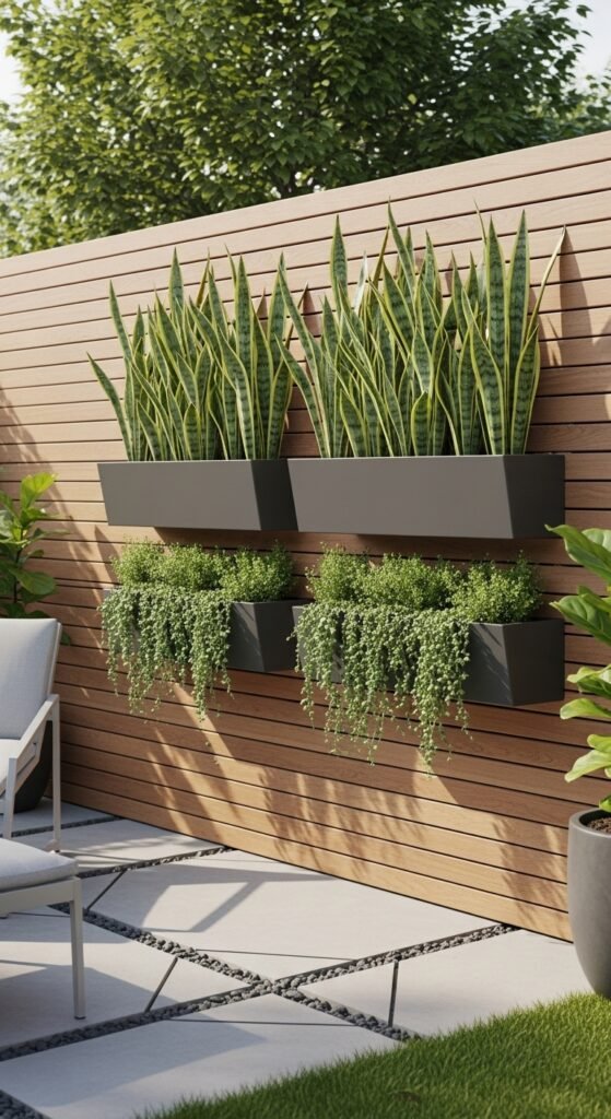 Idea: Use snake plants in vertical wall planters or mounted garden pockets on fences.