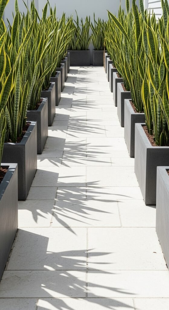 Why it works: The vertical structure of snake plants creates a clean, modern border that complements stone or wooden paths.