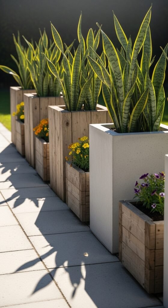 Outdoor Raised Planters – Durable materials like cedar wood or concrete that withstand weather and highlight snake plants.