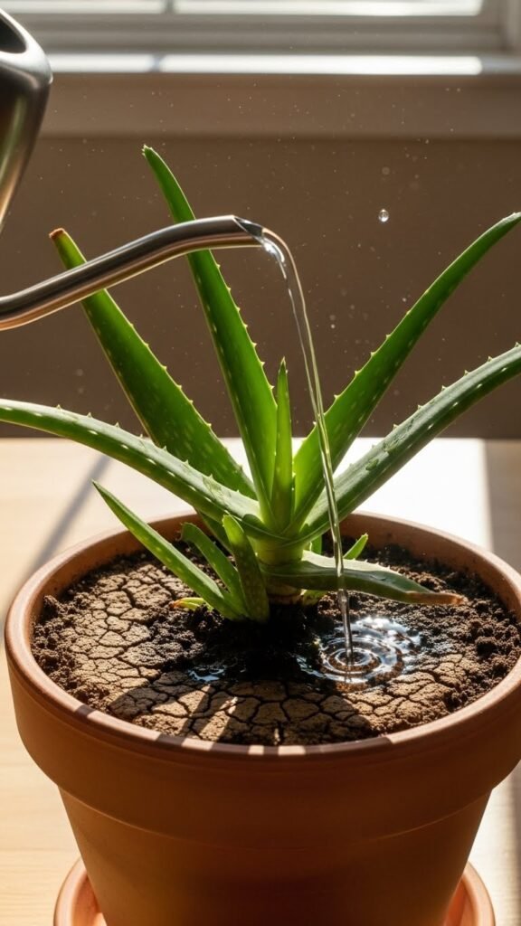 When I do water, I soak the soil thoroughly and let all excess water drain out. Aloe stores water in its leaves, so it doesn’t need frequent watering.