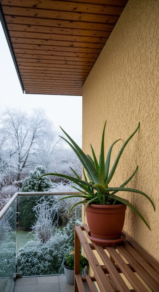 Winter rain and cold wind can cause leaves to turn soft, brown, or mushy. If your aloe stays outdoors, place it near a wall, balcony corner, or under a covered patio where it’s shielded from harsh weather.