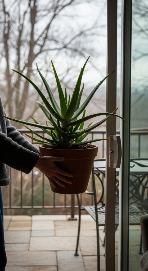 If you grow aloe in pots, move it indoors near a bright window before cold nights begin. If planted in the ground, cover it with frost cloth or relocate it to a sheltered area.