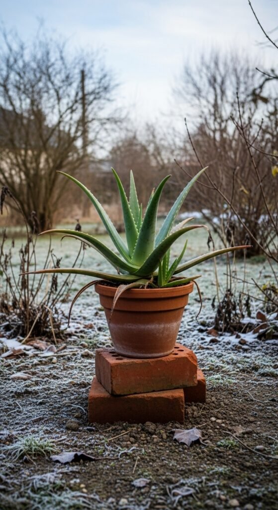 Cold ground can chill aloe roots. I always place outdoor aloe pots on pot feet, bricks, or wooden blocks during winter. This improves drainage and prevents cold damage to the root system.