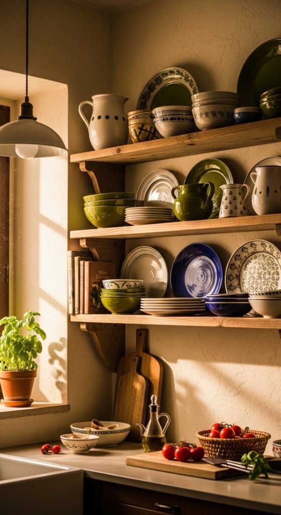 Italian kitchens often display everyday dishes instead of hiding everything in cabinets.