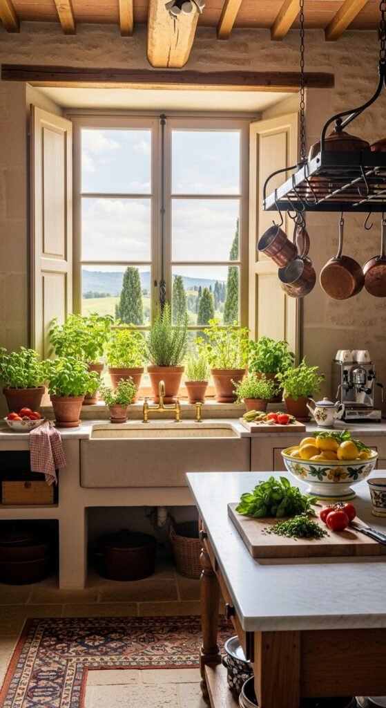 Italian kitchens often feel connected to nature. Fresh herbs and plants make the space look alive and natural.