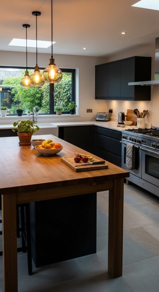 Warm lighting makes the kitchen feel perfect for evening cooking and family meals.