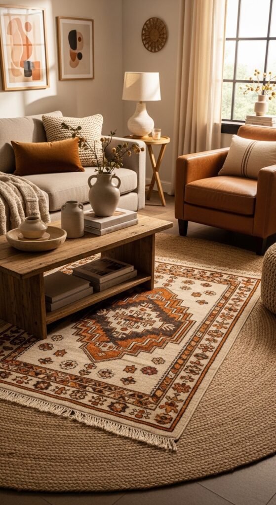 Layering rugs adds designer-level texture. Place a smaller patterned rug over a larger neutral one for contrast.