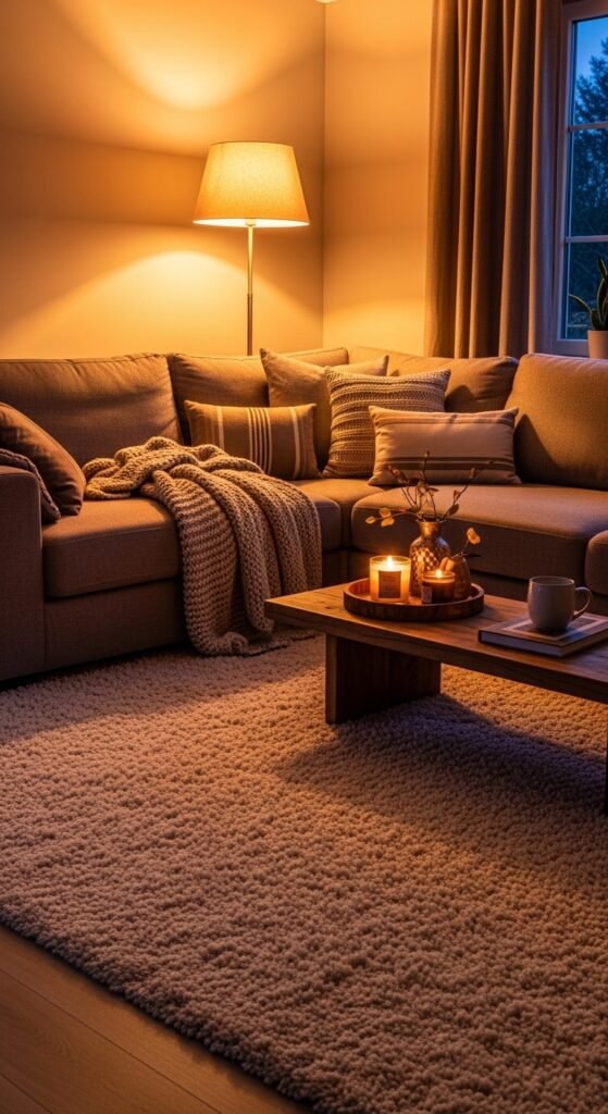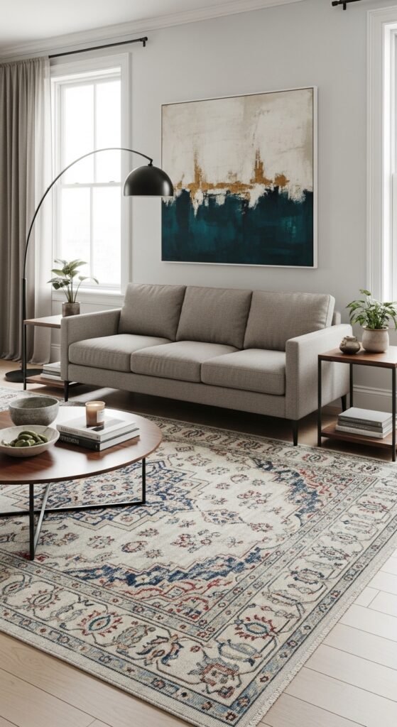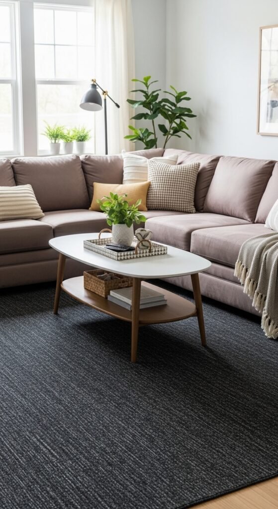 Beige, cream, and light grey rugs are the safest—and most versatile—choice. They match almost any sofa color and make seasonal decorating easier.