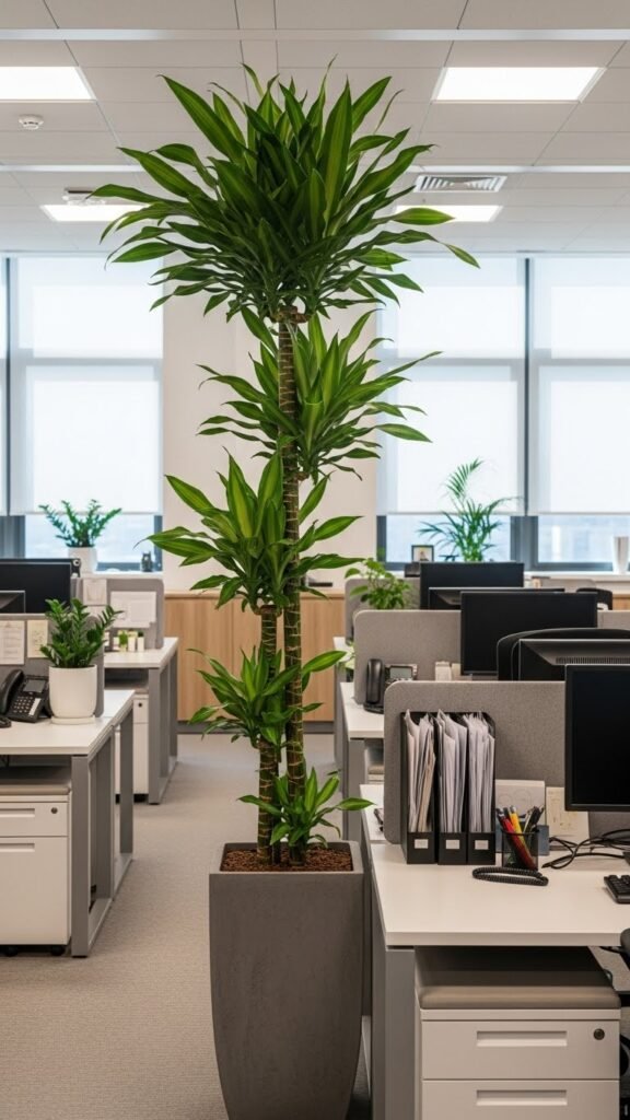 From personal workspace experience, dracaena holds its shape well and adds height without overwhelming the room. It’s especially effective in medium to large offices.