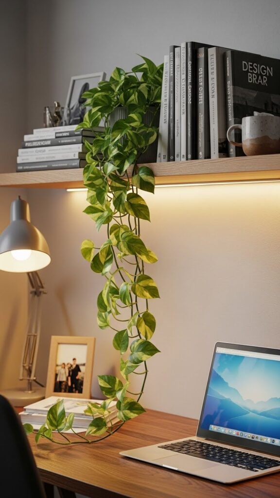 Pothos is one of the easiest indoor plants to grow and adapts well to office environments. It works equally well in small pots, hanging planters, or shelves.