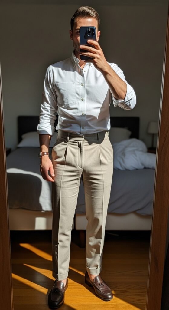 1. White Oxford Shirt + Beige Trousers + Loafers