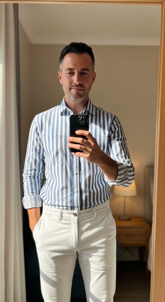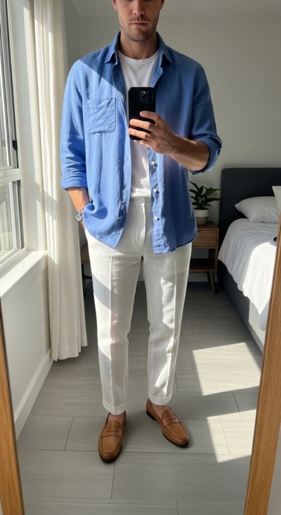 A breathable linen shirt paired with white trousers feels light, clean, and incredibly stylish.
