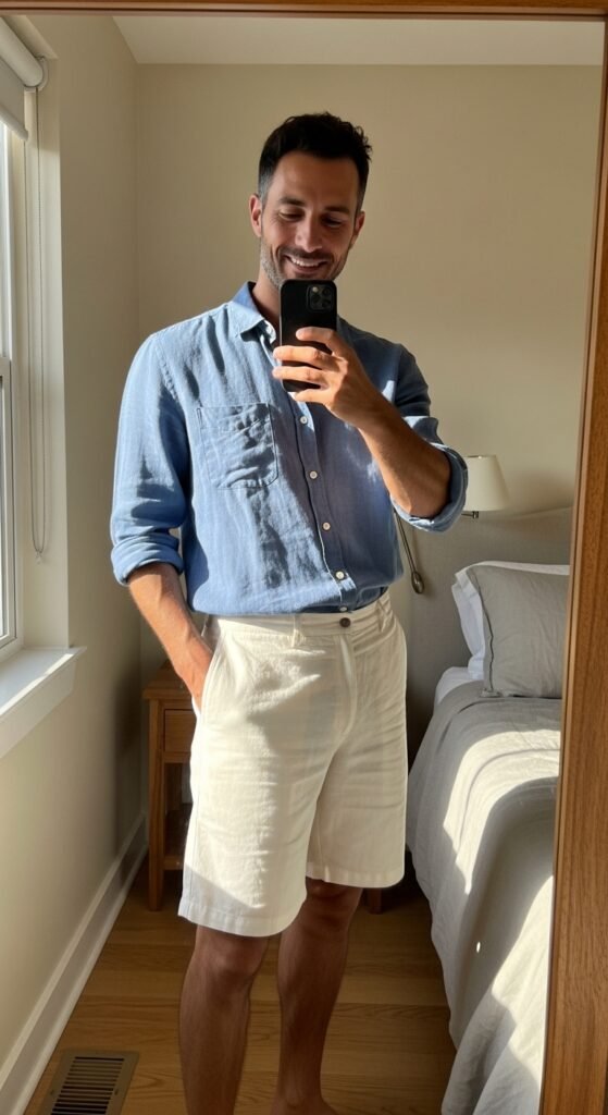 A relaxed button-down paired with linen shorts keeps things breathable but still polished.