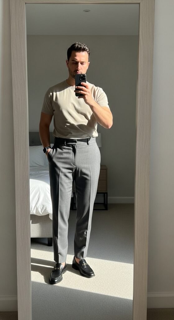 A well-fitted neutral t-shirt tucked into tailored trousers creates a clean, modern look.