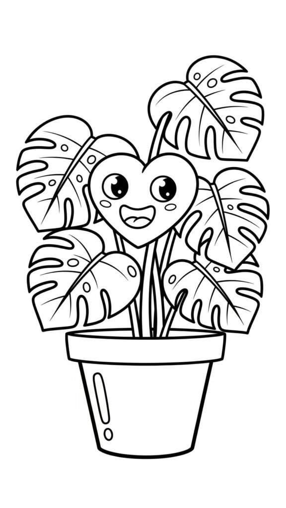 Playful, smiling monstera illustrations with bold lines for kids and beginner-friendly coloring.