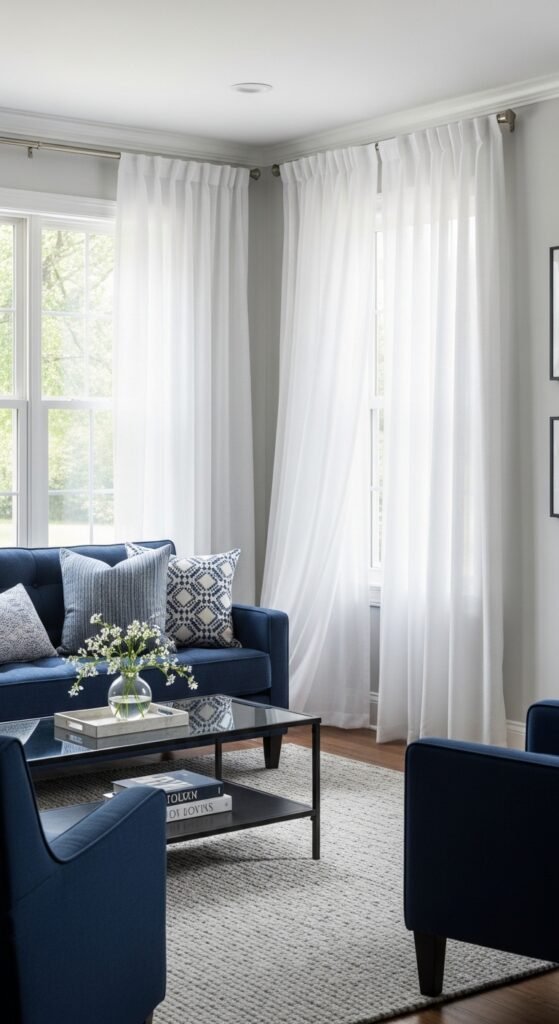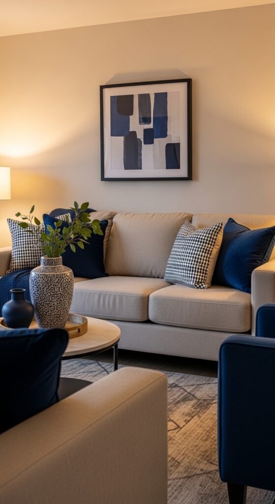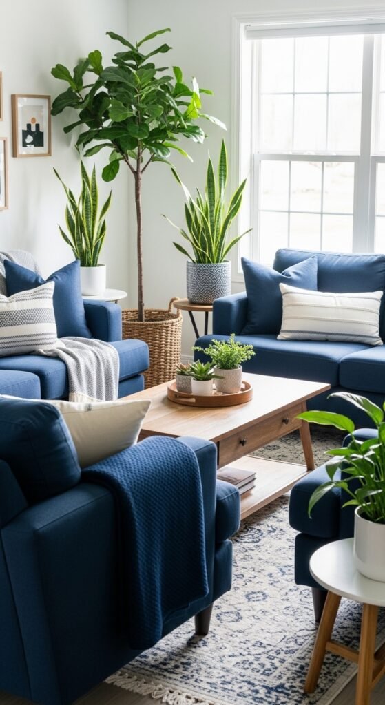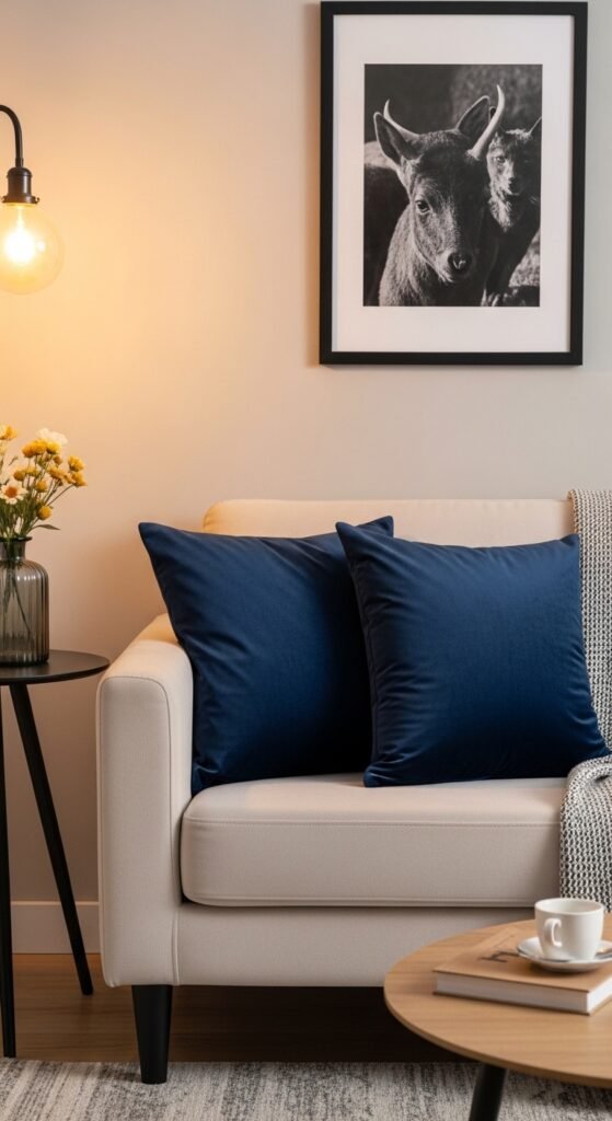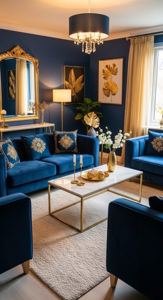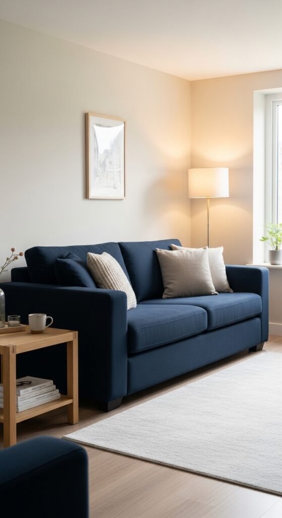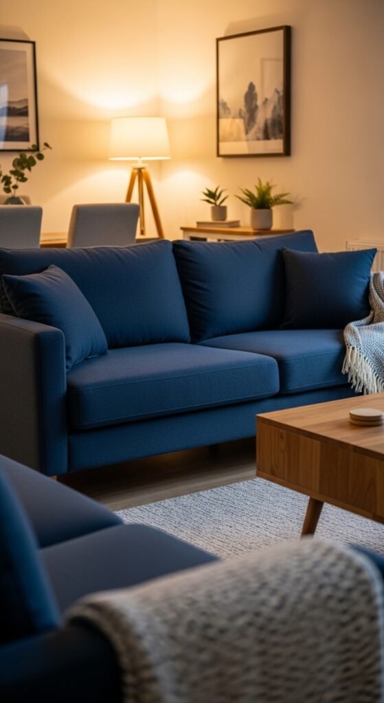 From my experience, you don’t need to go overboard just a few navy elements like a sofa, cushions, or decor can make a big impact.