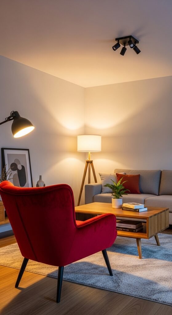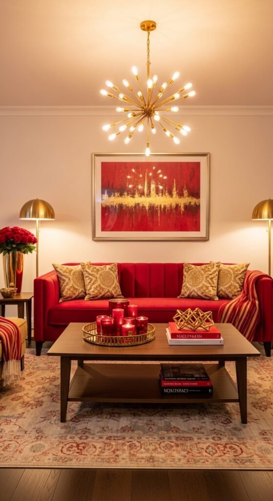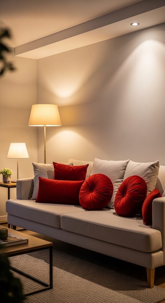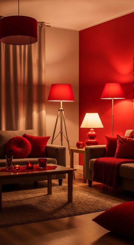 Warm lighting enhances red tones and makes the room feel cozy instead of harsh.