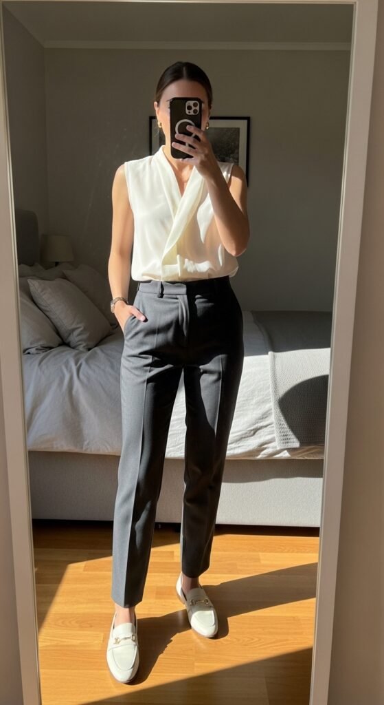 1. Sleeveless Blouse + Tailored Trousers + Loafers