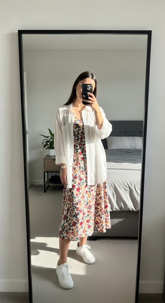 3. Floral Midi Dress + Oversized Button Shirt (Worn Open) + Sneakers