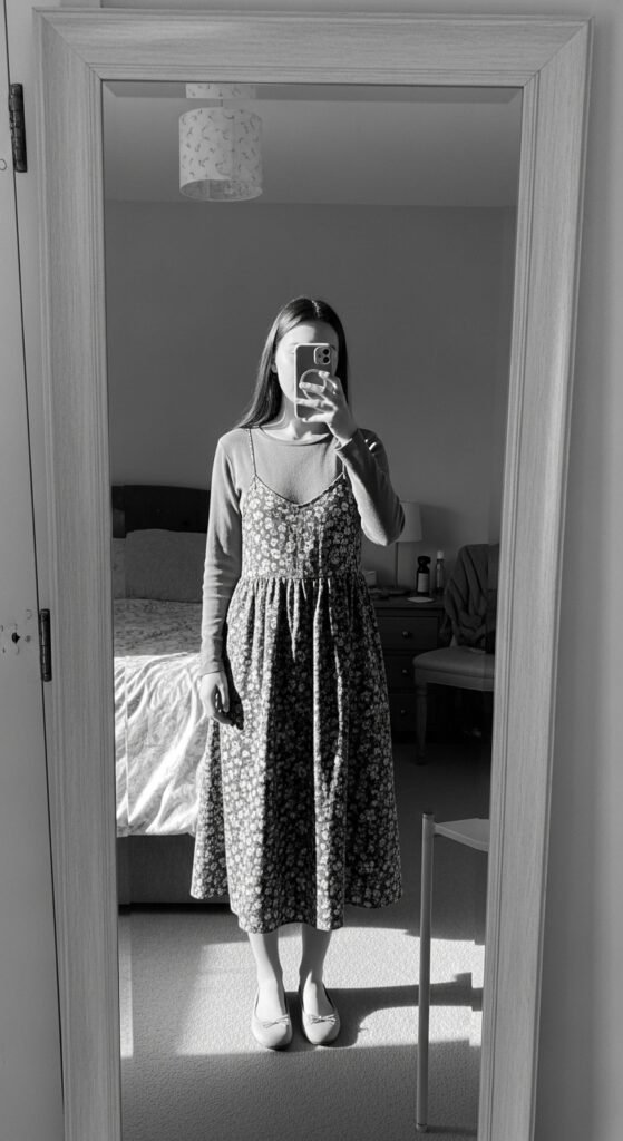 5. Floral Dress + Monochrome Layer (Same Color Shirt or Wrap) + Flats
