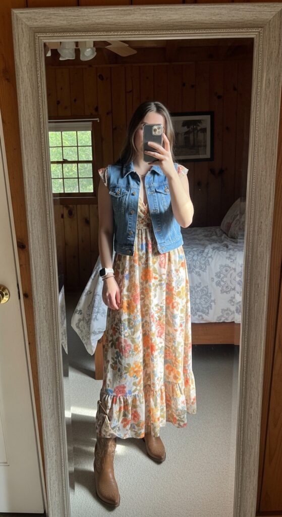 6. Floral Maxi Dress + Denim Vest + Western Boots=