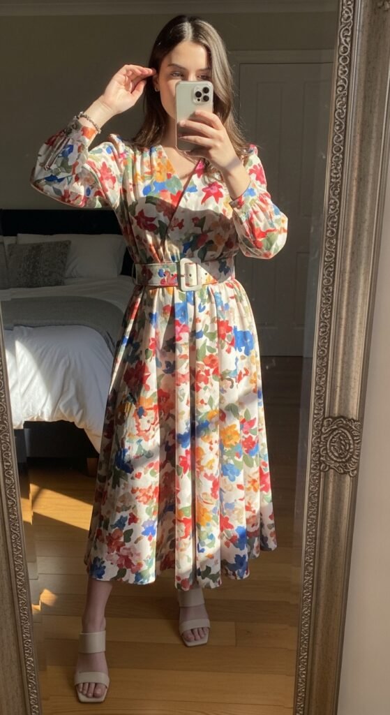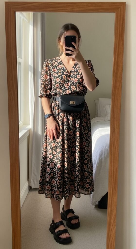 A belt bag adds structure and breaks the softness of florals, while chunky sandals give the outfit a grounded, modern edge.