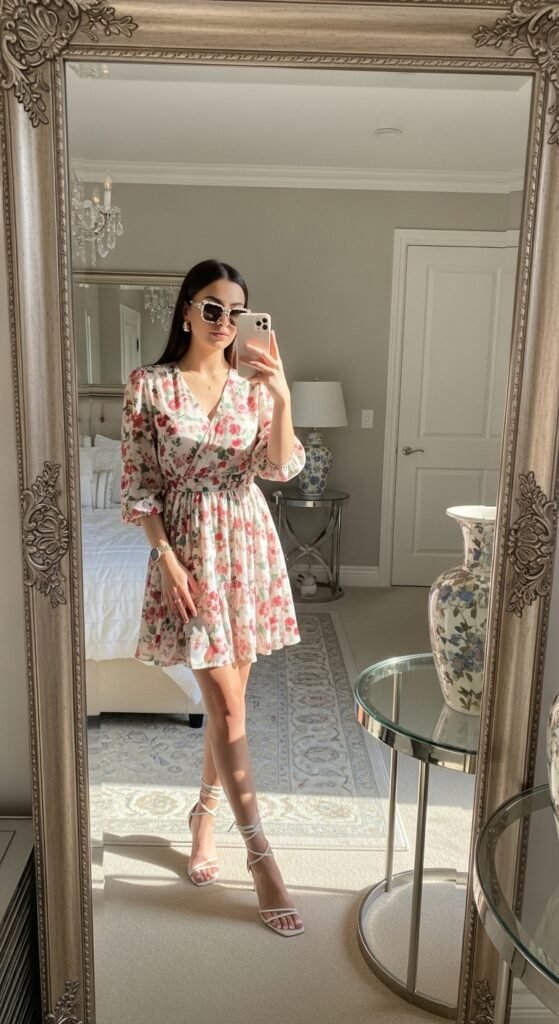 7. Floral Dress + Minimal Strappy Heels + Statement Sunglasses