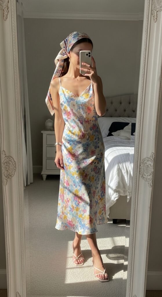 2. Floral Slip Dress + Lightweight Scarf (Hair or Neck) + Minimal Heels