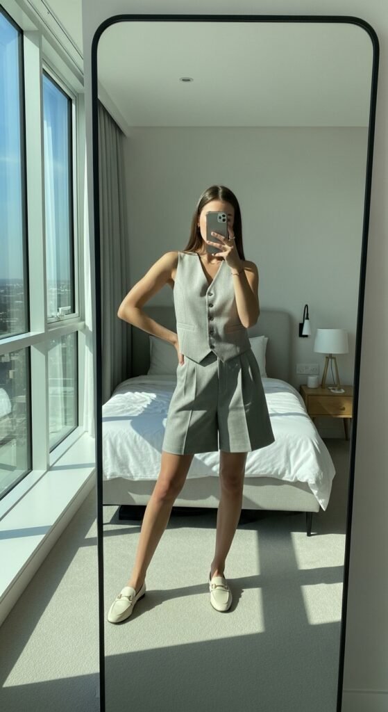 7. Sleeveless Vest Top + Tailored Shorts + Loafers πŸ’›