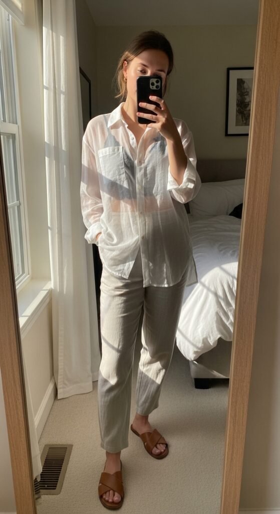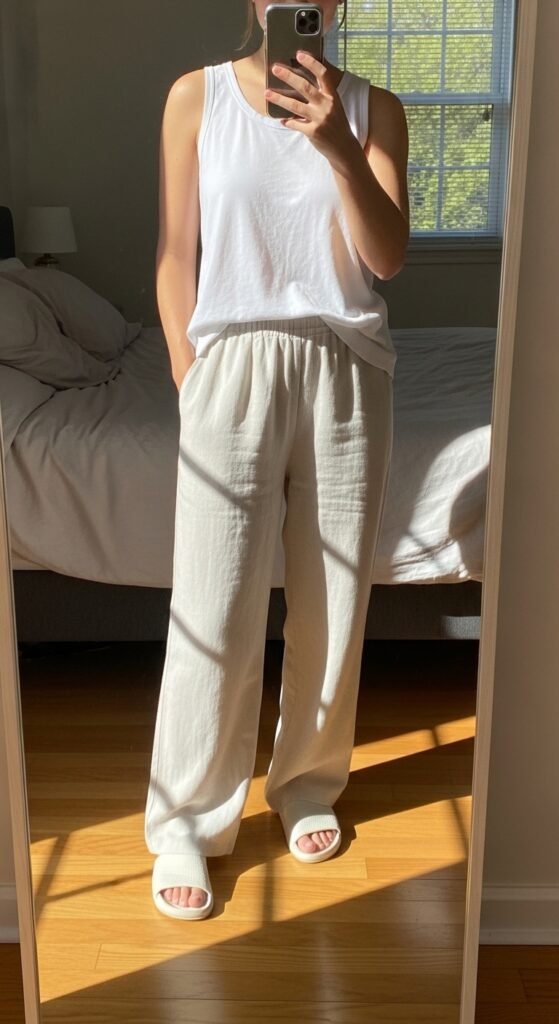 Everything is loose, breathable, and doesn’t cling. Linen pants allow airflow while the tank keeps it minimal.