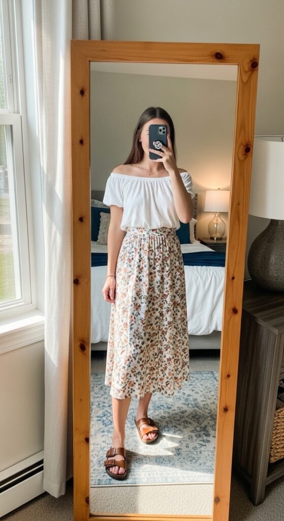 10. Off-Shoulder Top + Flowy Midi Skirt + Sandals
