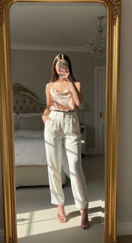 13. Satin Cami + Lightweight Trousers + Heeled Sandals (Evening Look πŸŒ™)
