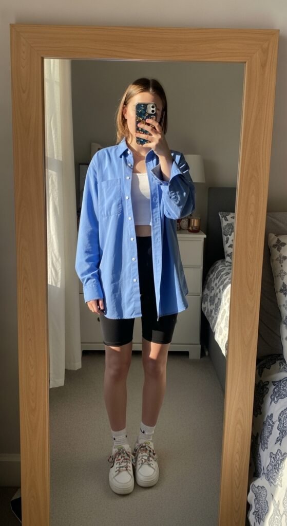 2. Oversized Shirt (Half Buttoned) + Biker Shorts + Sneakers