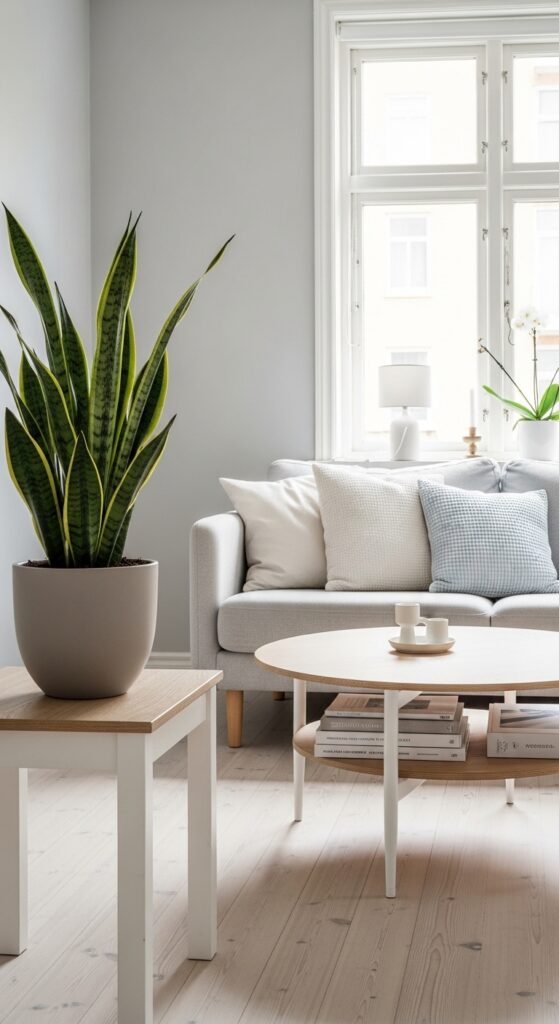 Snake plants, fiddle leaf figs, or simple eucalyptus stems in glass vases work beautifully. Ceramic planters in neutral tones blend seamlessly with the calm aesthetic.