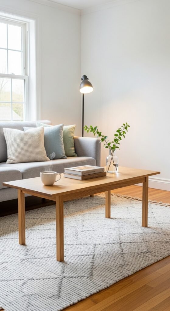 A light oak coffee table placed in a white living room instantly added warmth without darkening the space.